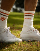 These socks made to land just below the calf. They are not dyed so it has a very slight natural egg shell color.